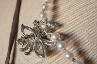 This necklace was made using vintage faux pearl beads and a very pretty silvertone, rhinestone, and faux pearl pendant. It measures 22" in length and can be worn with the pendant centered, or slightly off-center, as pictured. The floral pendant measures 1 3/4" at its widest.